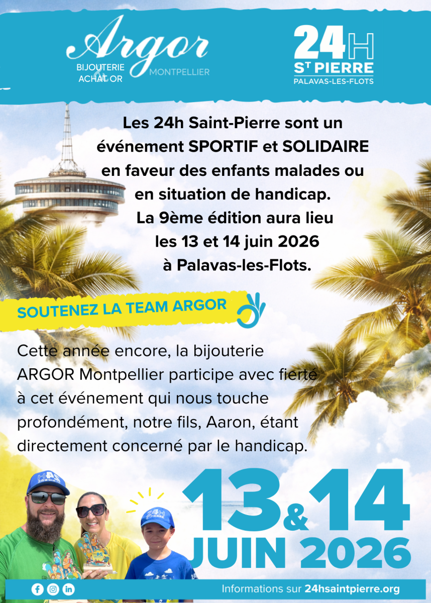 La bijouterie Argor Montpellier est fière de vous annoncer sa 3ᵉ participation aux 24h de Saint-Pierre, un défi caritatif qui se déroulera les 13 & 14 juin 2026.